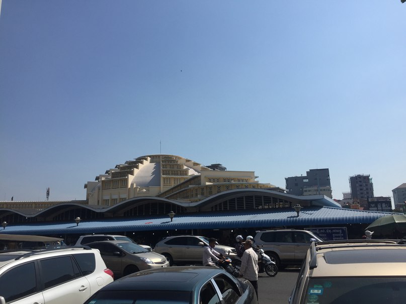 Столица Камбоджи утром выглядит намного интереснее, чем ночью. Днем по городу ездят дорогие машины, люди отдыхают в кафешках, некоторые спят на улице, но в Азии это много где можно увидеть. Сначала я отправился на рынок Phsar Thmei, он выделяется среди остального городского пейзажа красивой архитектурой крыши. На рынке можно попробовать множество экзотичных блюд, как сомнительного происхождения, так и довольно съедобных на вид. Но надолго Вы тут вряд ли задержитесь.